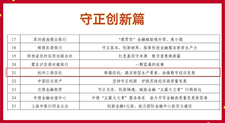 近日,中国银行业协会正式印发《银行业践行中国特色金融文化案例集》,杭州工商信托报送的《数据信托:激活新型生产要素,助推数字经济发展》一文成功入选案例集“守正创新篇”。